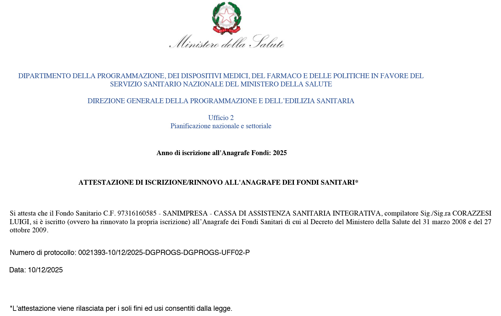 Sanimpresa, come previsto dalla nuova normativa sui fondi di assistenza sanitaria integrativa (Decreto del Ministero della Salute del 31 Marzo 2008 e del 27 ottobre 2009), ha ottenuto l’iscrizione all’Anagrafe dei Fondi Sanitari.
